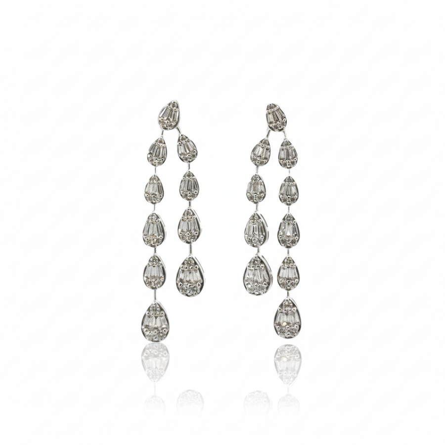 Exquisitos aretes de oro sólido que caen con unas delicadas gotas formadas por diamantes naturales en distintos cortes creando el...