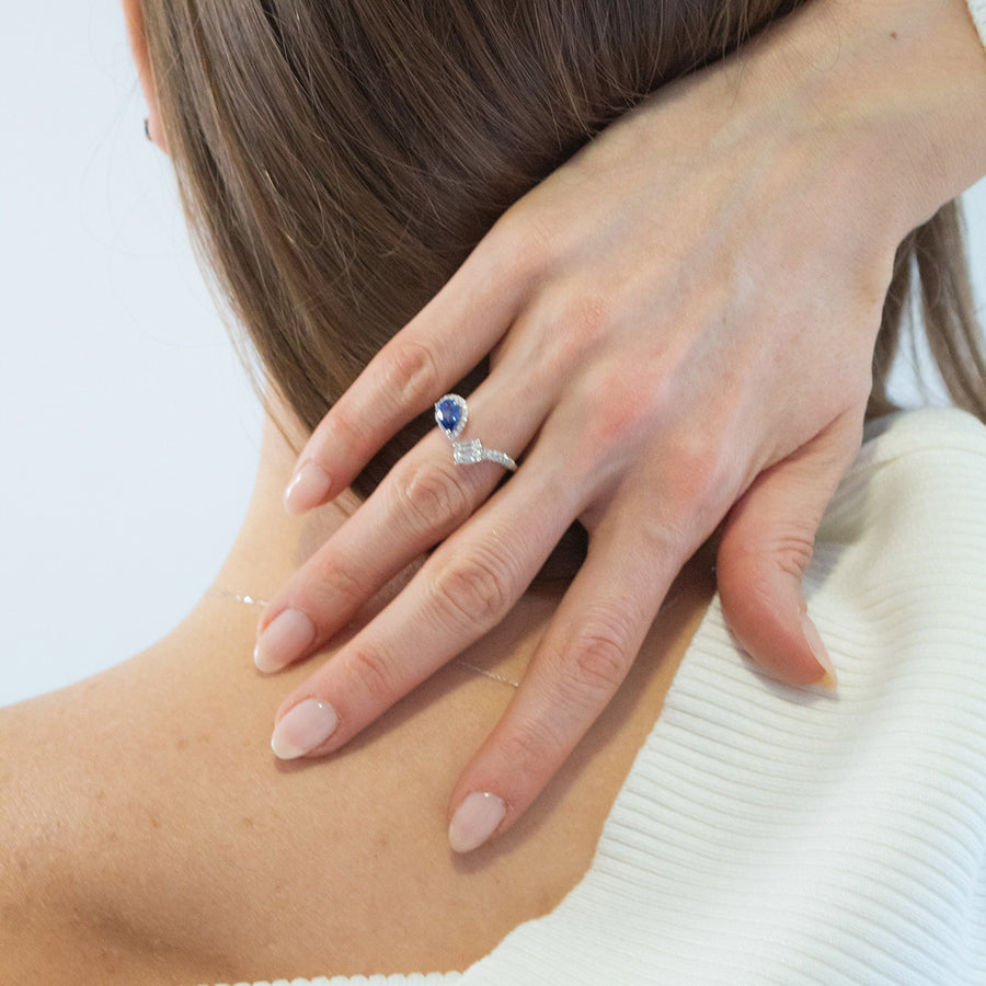 Este anillo de oro sólido es una verdadera obra de arte. Su diseño de banda abierta le permite lucir en un extremo un hermoso zafiro natural en corte pera rodeado por un halo de diamantes corte brillante, mientras que en el otro extremo resplandecen diamantes corte baguette y brillante que lucen como una gema de mayor tamaño. Para complementar, la banda del anillo tiene delicados diamantes en montado pavé en la mitad frontal.